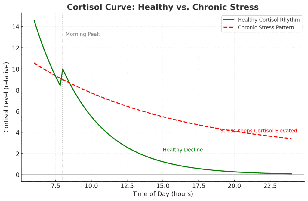 But when stressors accumulate, cortisol rhythms flatten or stay chronically high — leading to fatigue, poor sleep, and long-term health risks.